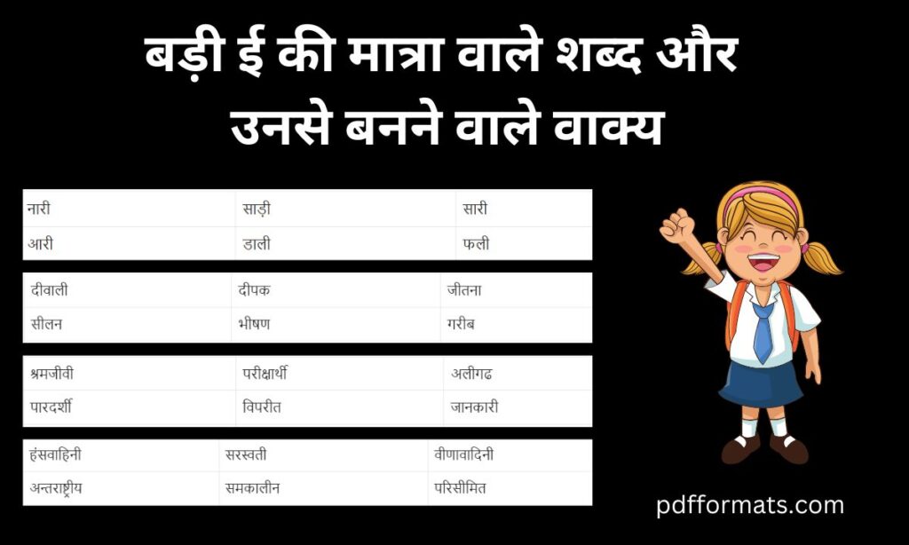 ऊपर दिए गए Badi ee ki Matra Wale Shabdon में कहीं न कहीं ई की मात्रा का प्रयोग किया गया है|